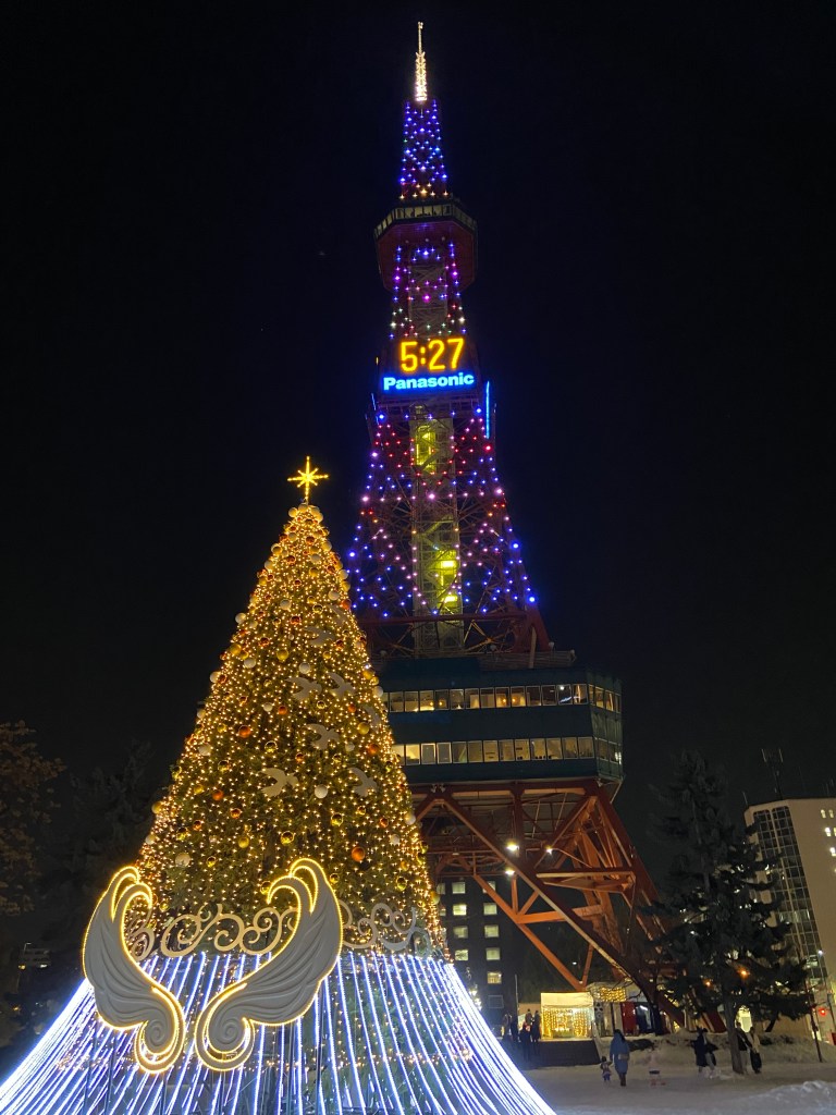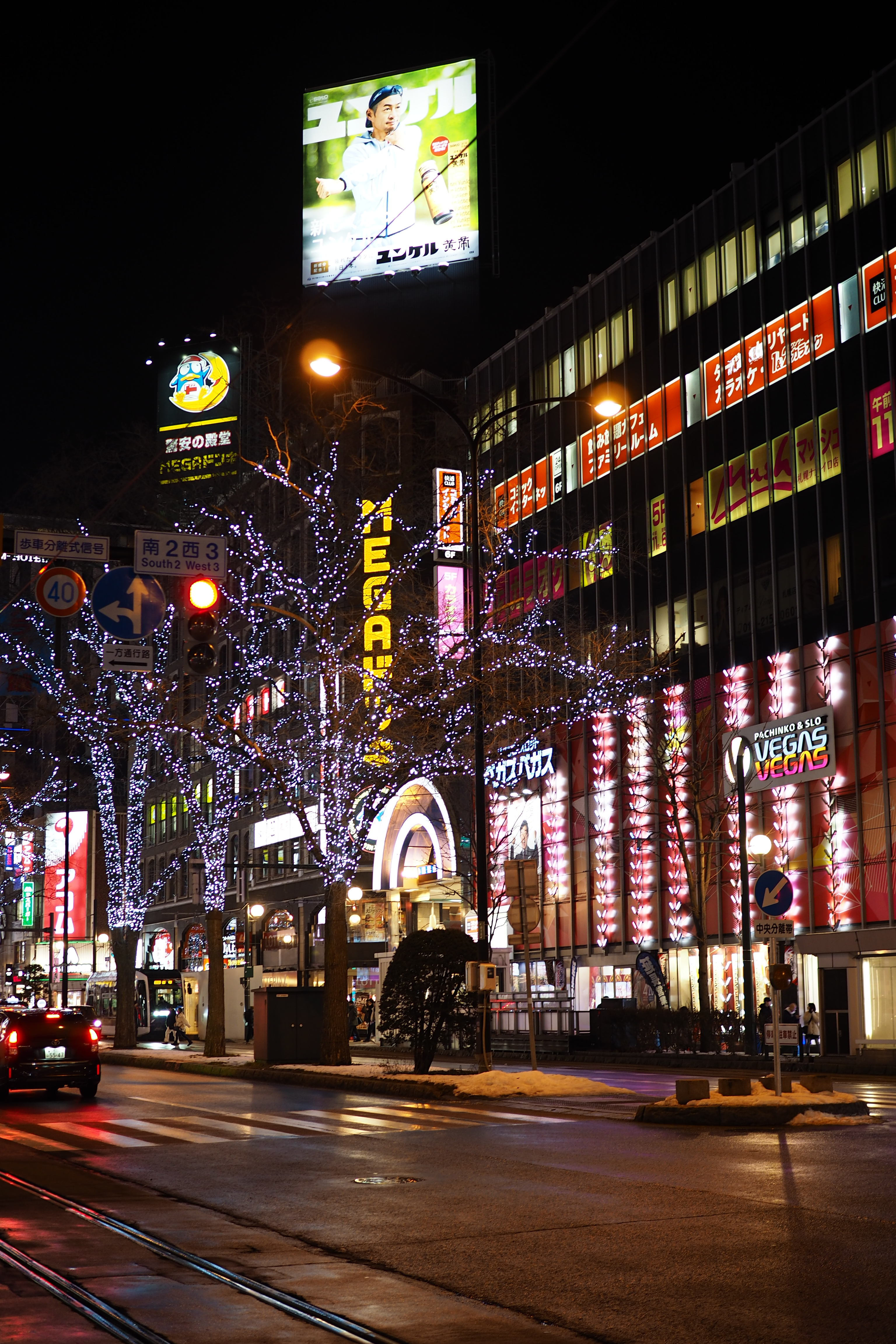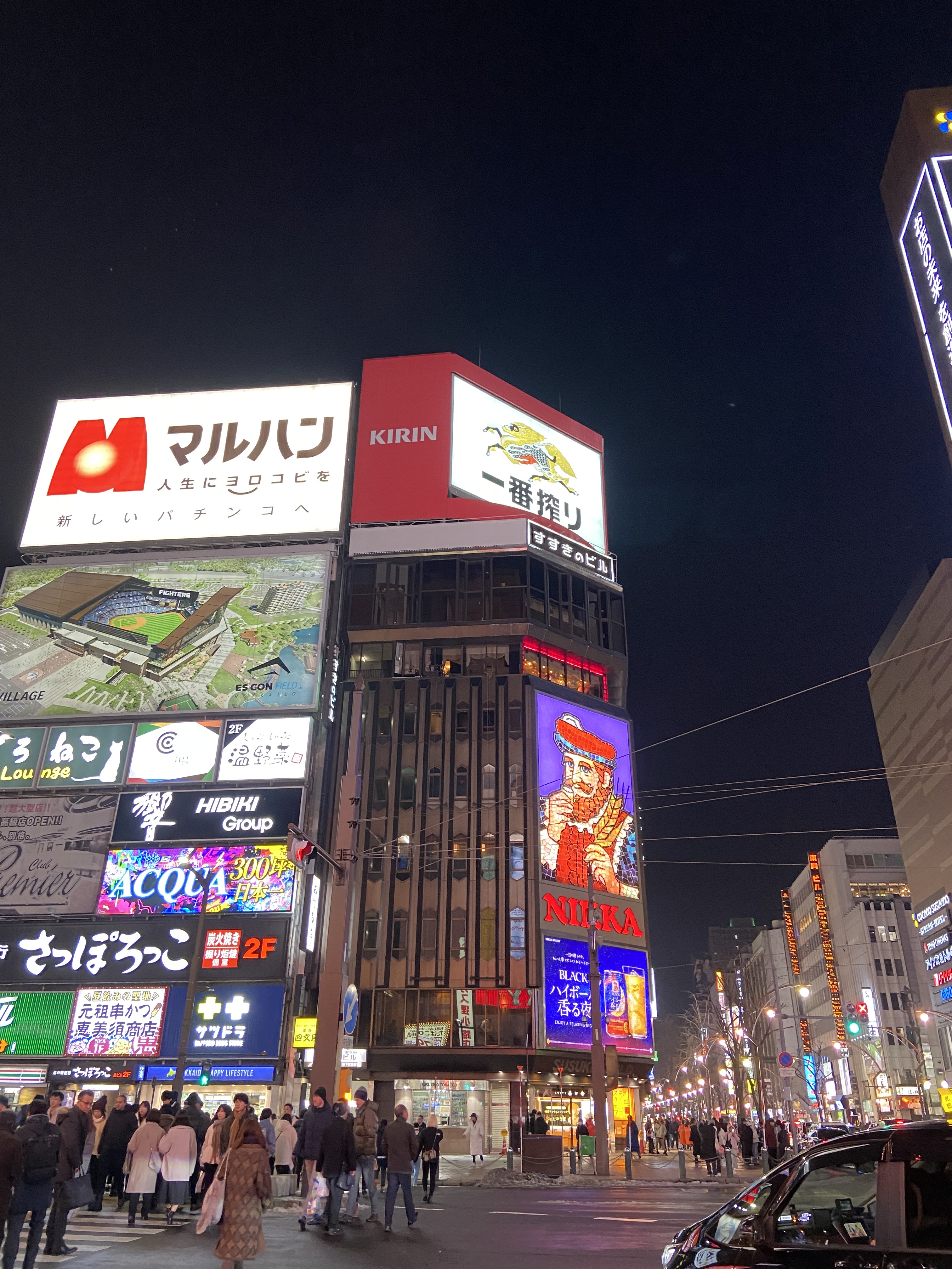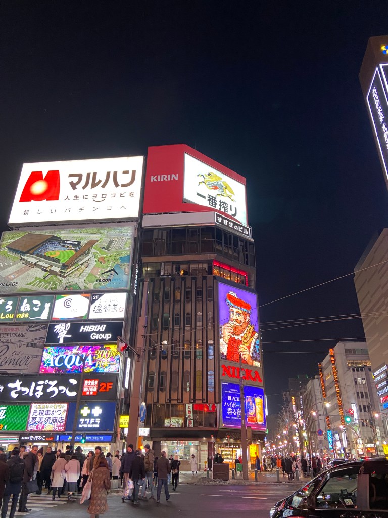 Unser nächster Stopp war der Sapporo Tower, der eine gewisse Ähnlichkeit mit dem Tokyo Tower hat. Der Weg dorthin führte durch das Ausgehviertel Susukino. Dort zeigte sich wieder die typische, grelle Beleuchtung mit riesigen Werbetafeln, wie man es oft in japanischen Grossstädten sieht.