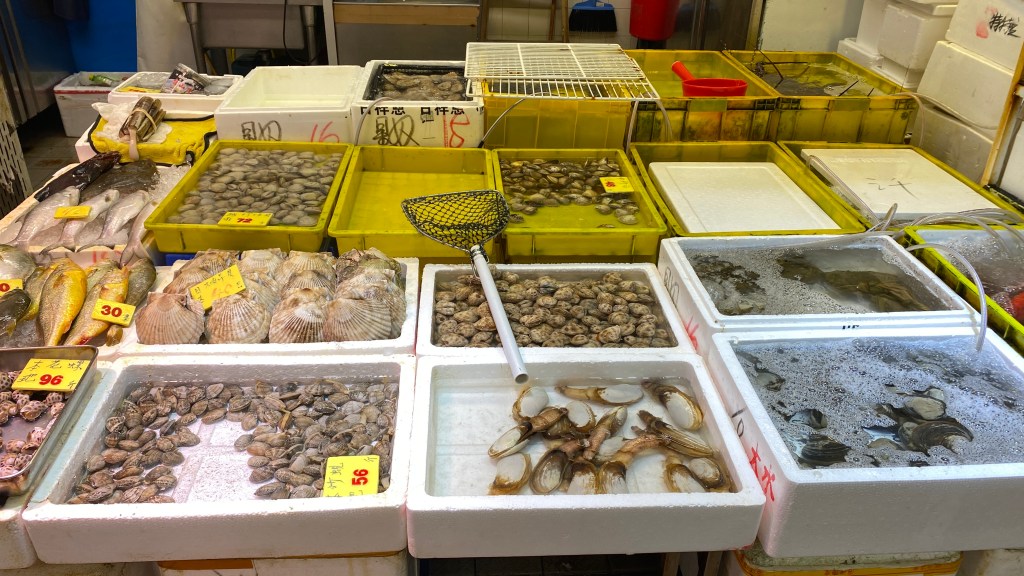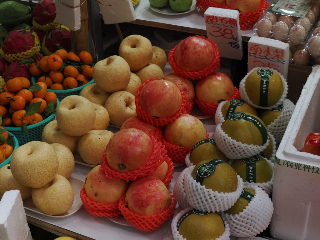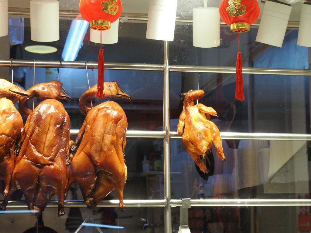Ebenso gibt es an zahlreichen Stellen Enten, Würste, frisches Gemüse und Obst. Teilweise sieht es schon recht „exotisch“ aus. Zum Thema Essen möchte ich schon mal vorwegnehmen, das ist wirklich sehr, sehr gut in Hongkong und die für uns speziellen Sachen wie z.B. Frösche, Schlangen etc. gibt es in vielen Restaurants nicht, und wenn, dann sind sie teurer als die regulären Speisen.