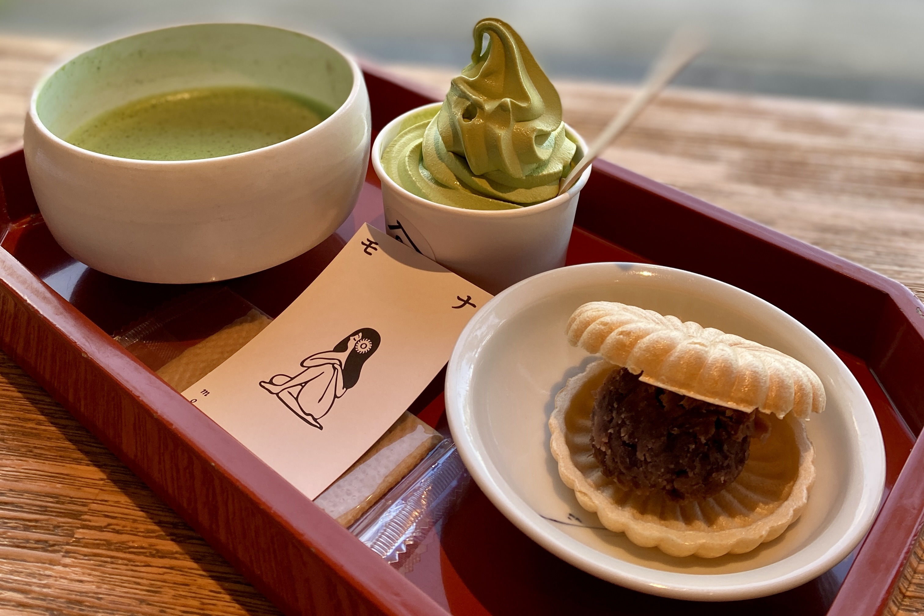Ebenso gibt es verschiedene Cafés, wie das &LOCALS, das mir am besten gefallen hat, wegen des Angebots an traditionellen Speisen. Im Foto ist ein Setmenu mit Matcha, Grünte Glacé und einer Waffel mit Rotebohnenpaste.
